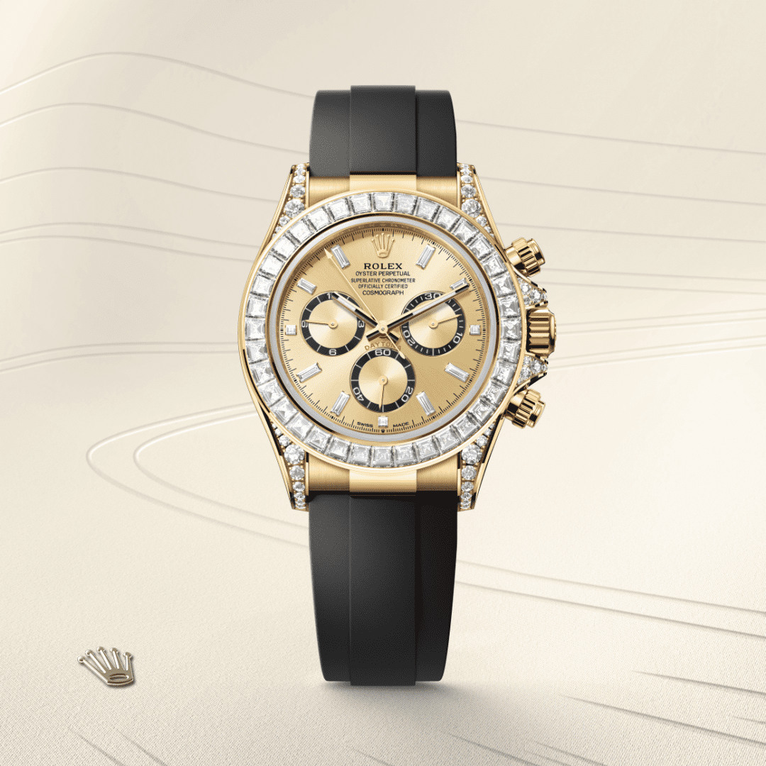 18 karat guldversionerne af Cosmograph Daytona med en Cerachrom-krans er tilgængelige med en Oysterflex-urlænke. Lænken, der er udviklet af Rolex og patenteret, kombinerer på enestående vis robustheden fra en metalurlænke med komforten fra en elastomerurlænke. Den består af to fleksible, buede metalblade - ét i hver del af urlænken - overstøbt med højeffektiv sort elastomer. For at sikre den bedste komfort er Oysterflex-urlænken udstyret med puder på indersiden og en Oysterlock-sikkerhedslås for at forhindre utilsigtet åbning. Dens længde kan justeres via det innovative Rolex Glidelock-udvidelsessystem.