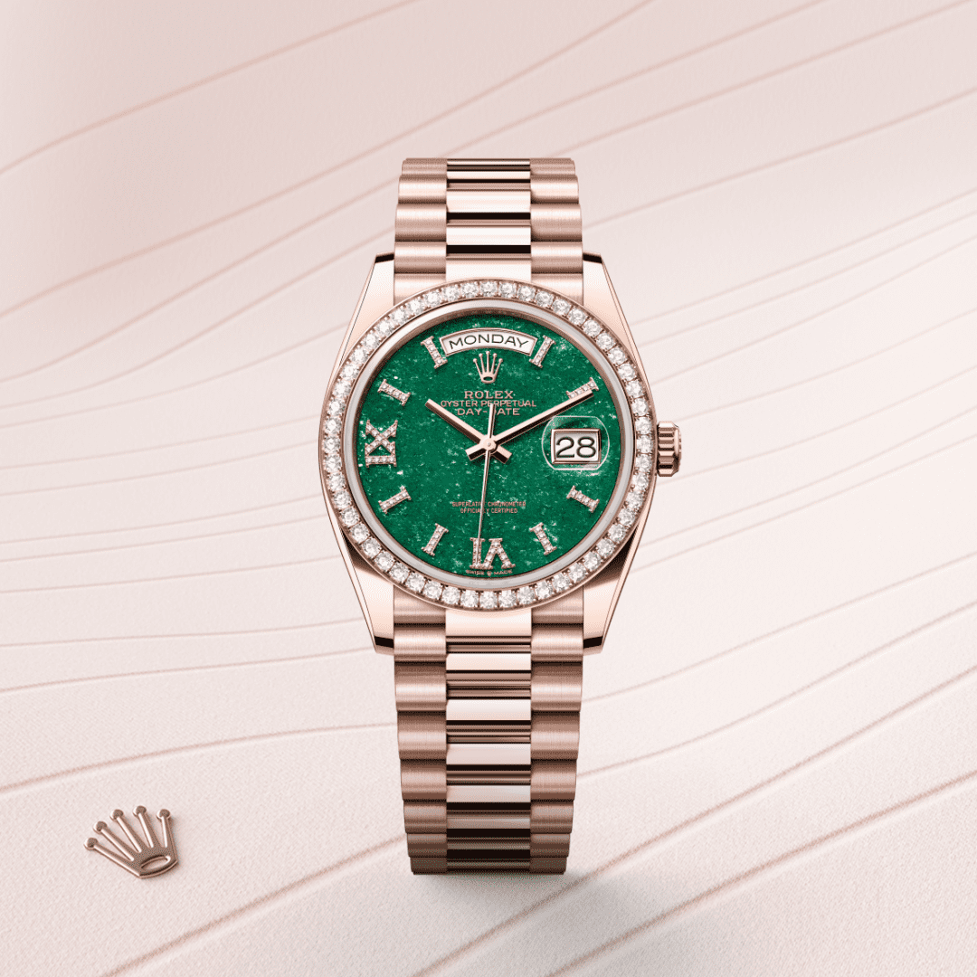 Denne urskive tilbyder timemarkører i 18 karat guld besat med 32 diamanter, romertal VI og IX i 18 karat guld besat med 24 diamanter. Den er skåret af grøn aventurin, en sten med en fint krystalliseret overflade.Urskiven er Rolex-urets distinkte ansigt udadtil, det træk som er mest definerende for urets identitet og læsbarhed. Rolex-urskiver, som er karakteriseret ved timemarkører formet af guld for at undgå anløbning, bliver alle designet og fremstillet in-house, hovedsageligt i hånden, for at sikre absolut perfektion.