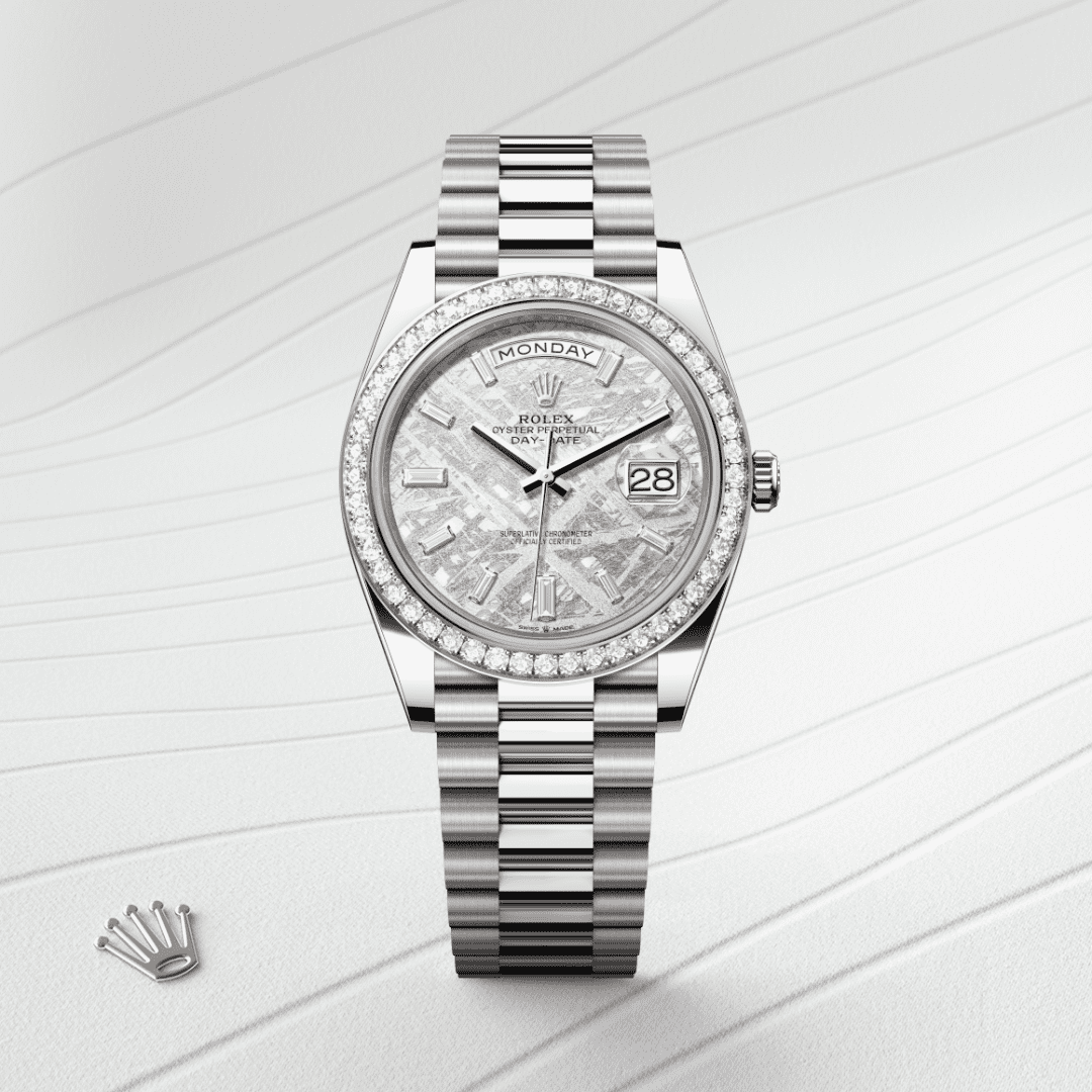 Denne urskive tilbyder 10 baguetteslebne diamanter. Metallisk meteorsten er dannet i solsystemets fjerneste egne og stammer fra en asteroide, der eksploderede for millioner af år siden. Fragmenterne af dette naturlige udenjordiske materiale, der primært består af jern og nikkel, rejser mellem planeterne og afkøles nogle få grader for hver gang, det har rejst en million år - hvilket skaber en unik, karakteristisk krystallisering i materialet, som det er umuligt at genskabe på Jorden. Metallisk meteorsten er sjælden og udfordrende at arbejde med, men når den først er skåret i tynde udsnit og behandlet kemisk, afsløres den store skønhed i dens sammenvævede indre struktur. Disse fascinerende og varierede formationer er kendt som Widmanstätten-mønstre. Rolex samarbejder med førende eksperter på området og til urskiverne vælges kun de udsnit af meteorsten, der har en særligt velformet overflade med mange forskellige former og refleksioner.