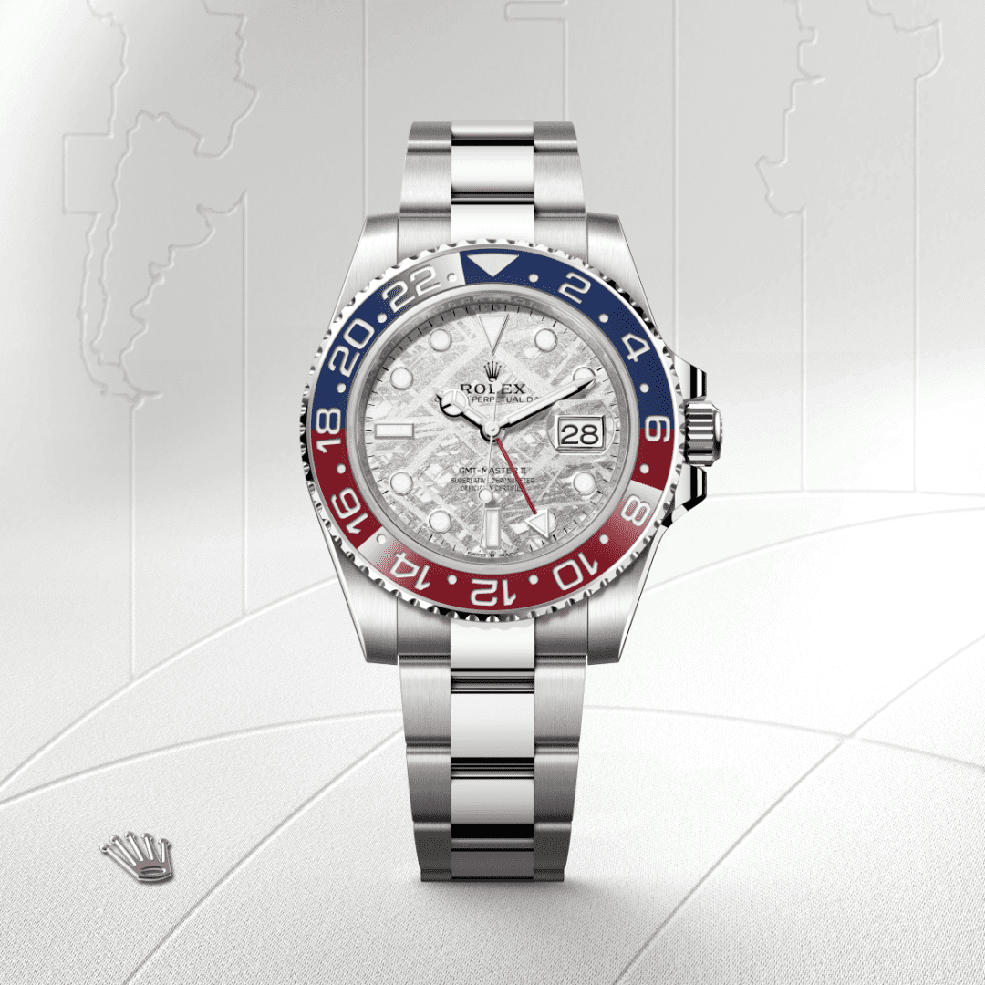 Denne model er den eneste GMT-Master II med en meteorit-urskive. Meteorit kommer fra hjertet af en asteroide, eller måske endda en planet, der er eksploderet og har slynget materiale tværs igennem solsystemet, indtil tilfældet bringer det ind i vores bane og tyngdekraften trækker det ned til Jorden. I løbet af sin rejse transformeres midten af meteoritten gradvist, hvilket producerer meget usædvanlige metalliske mønstre som resultat af den meget langsomme afkøling af de smeltede asteroide-kerner. Rolex’ designere skaber fra disse konfigurationer en unik skat af nogle af de mest prestigefyldte modeller, inklusive denne GMT-Master II.