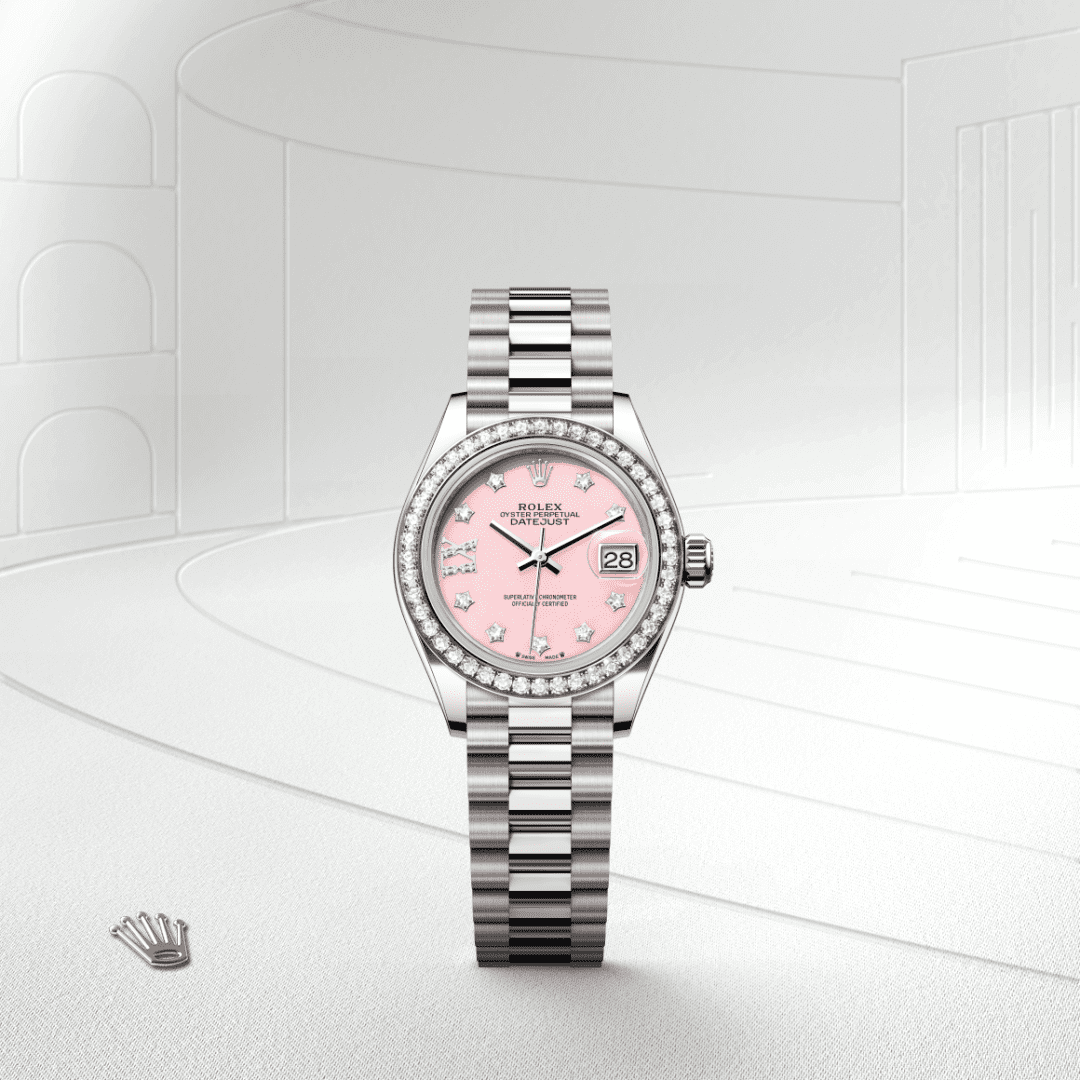 Denne urskive tilbyder diamanter i 18 karat guldfatning og romertallet IX i 18 karat guld, besat med 8 diamanter. Rolex har udviklet en særlig ekspertviden inden for fremstilling af urskiver, der er lavet af dekorative sten, såsom pink opal. De stenskiver, der skal bruges til urskiverne, skæres ud af en blok råmateriale. Der udvælges kun de sten, hvis farve og struktur fuldt ud opfylder mærkets strenge æstetiske krav. De er udset til at pryde skiven på et Rolex-ur og give det en unik personlighed.