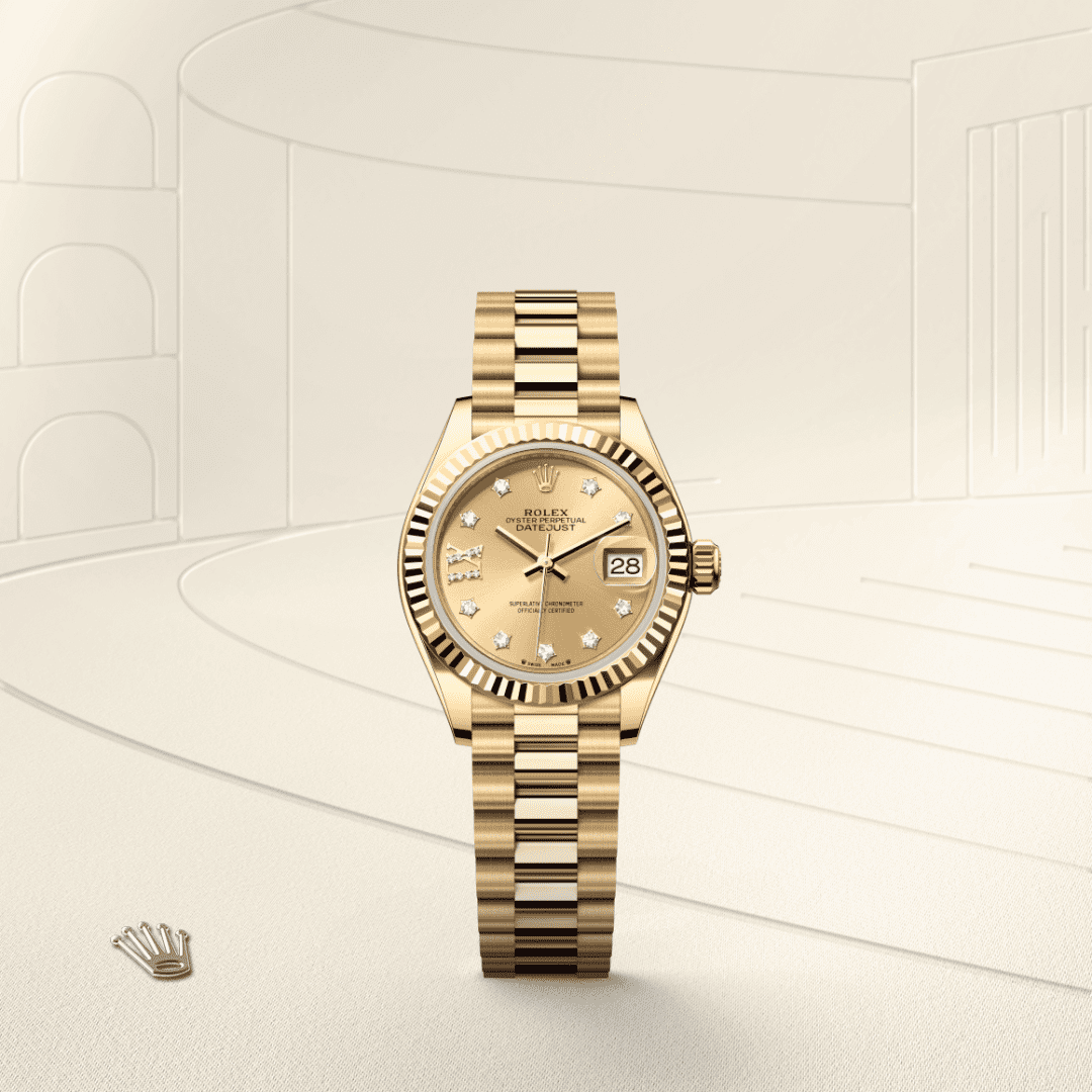 Den rillede krans er et vartegn for Rolex. Oprindeligt havde rillerne på Oyster kransen et funktionelt formål: de anvendtes til at skrue kransen på kassen og hjalp med at sikre urets vandtæthed. De var derfor identiske med rillerne på bagsiden, som også blev skruet fast på kassen ved anvendelse af særlige Rolex-værktøjer for at sikre vandtæthed. Med tiden blev rillerne et æstetisk element, et ægte Rolex-signaturtræk. I dag er den rillede krans fra Rolex et vartegn - og i guld på Lady-Datejust her.
